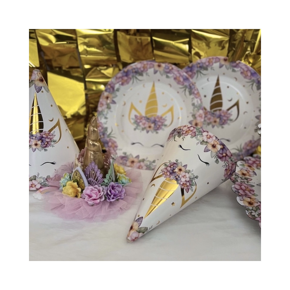 10 stk Enhjørning papphatter med gullhorn. Hattene holdes på plass med strikk.