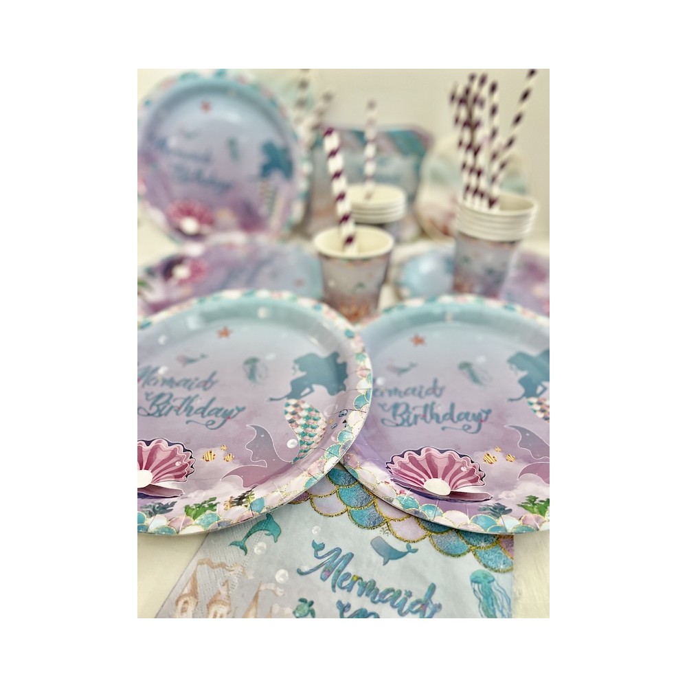 En perfekt pakkeløsning når en liten Havfrue skal feires. Denne pakken inneholder det du trenger for å dekke bordet, ballonger og bursdagsbanner til å pynte med, samt en oppblåsbar Havfrue hårbøyle til bursdagsbarnet....