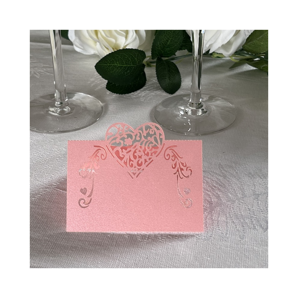 10 stk rosa laserkuttede bordkort med stort hjerte. Hjertet står opp over bordkortet når kortet brettes i to. Perfekt til selskap, bryllup og konfirmasjon.