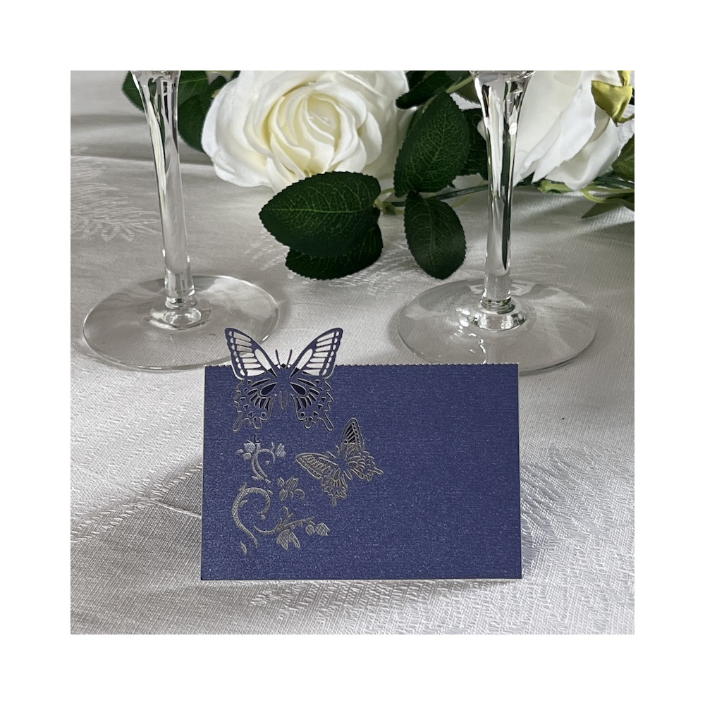 10 stk flotte bordkort i blå papp med sommerfugler som står opp over bordkortet når de er brettet i to. Perfekt til alle selskap, bryllup og konfirmasjon.