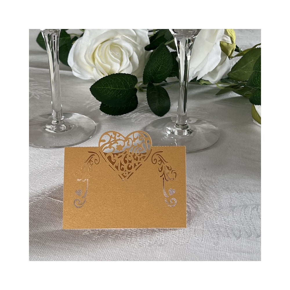 10 stk bordkort i børstet gull med stort laserkuttet hjerte. Hjertet står opp over bordkortet når kortet brettes i to. Perfekt til selskap, bryllup og konfirmasjon.