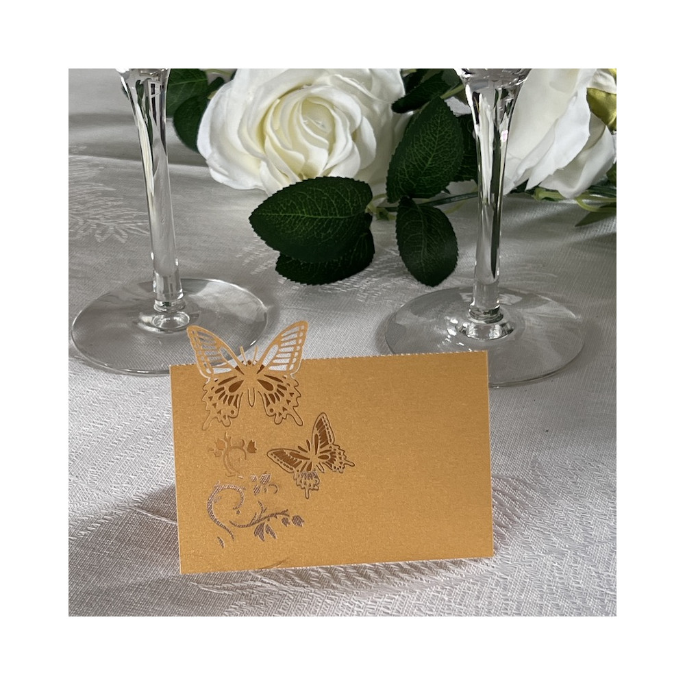 10 stk flotte bordkort i gull med sommerfugler som står opp over bordkortet når de er brettet i to. Perfekt til alle selskap, bryllup og konfirmasjon.