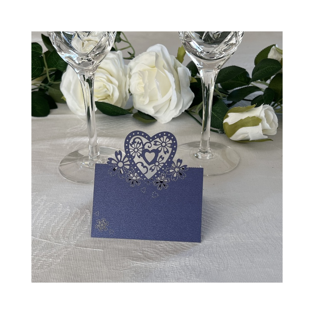 10 stk flotte mørkeblå bordkort med stående hjerte. Når kortene brettes i to står hjertet og blomstene opp, over kortet.