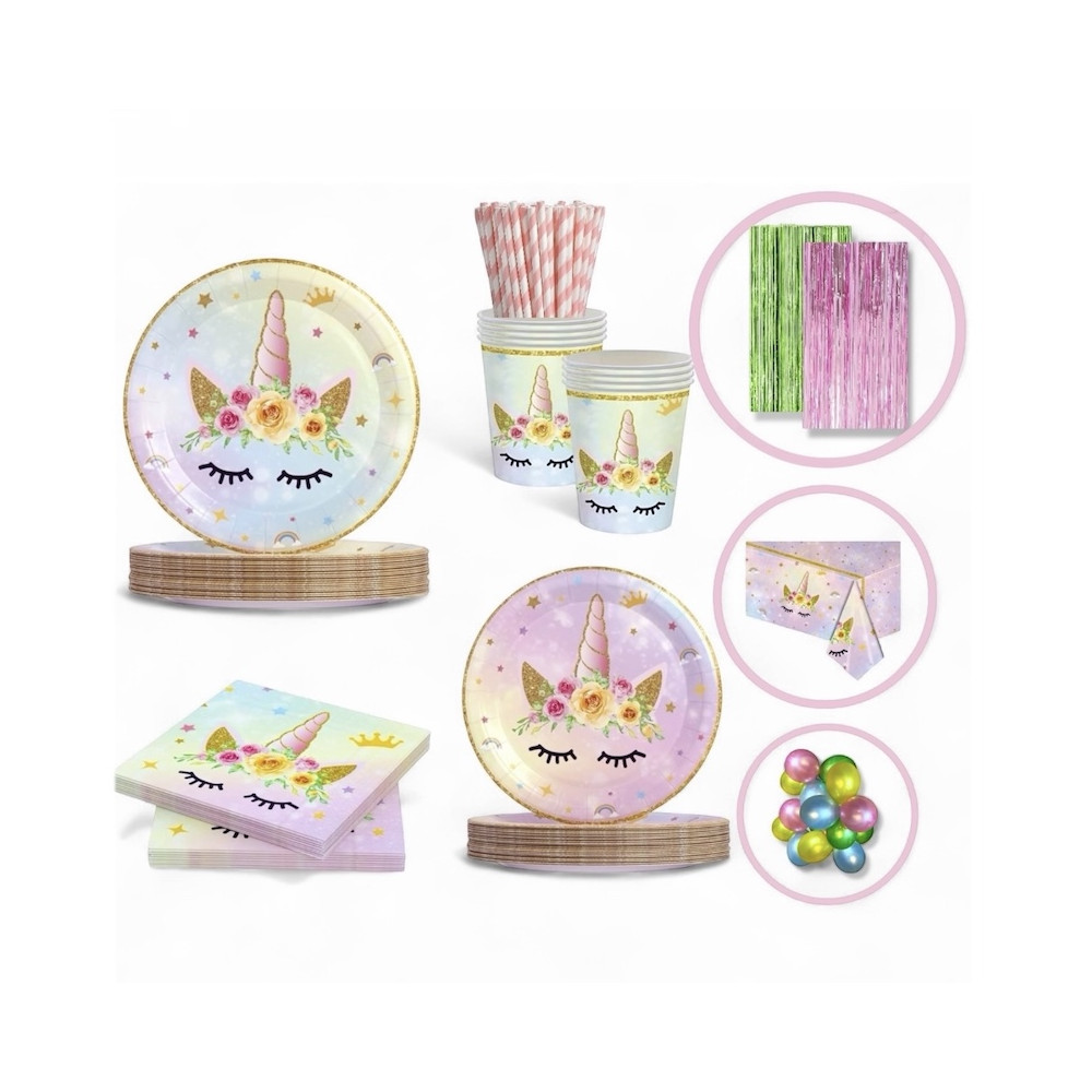 Nydelig Enhjørning bordpakke i pastellfarger. Pakken inneholder alt du trenger for å pynte et lekkert Enhjørningbord. De skinnende glittergardinene, én i rosa og én i eplegrønn, matcher de lekre nyansene i bordpakken og skaper ekstra glans til festen. Pakken har også 20 ballonger i rosa, blått, grønt og gult som gir rommet enda mere bursdagsstemning.