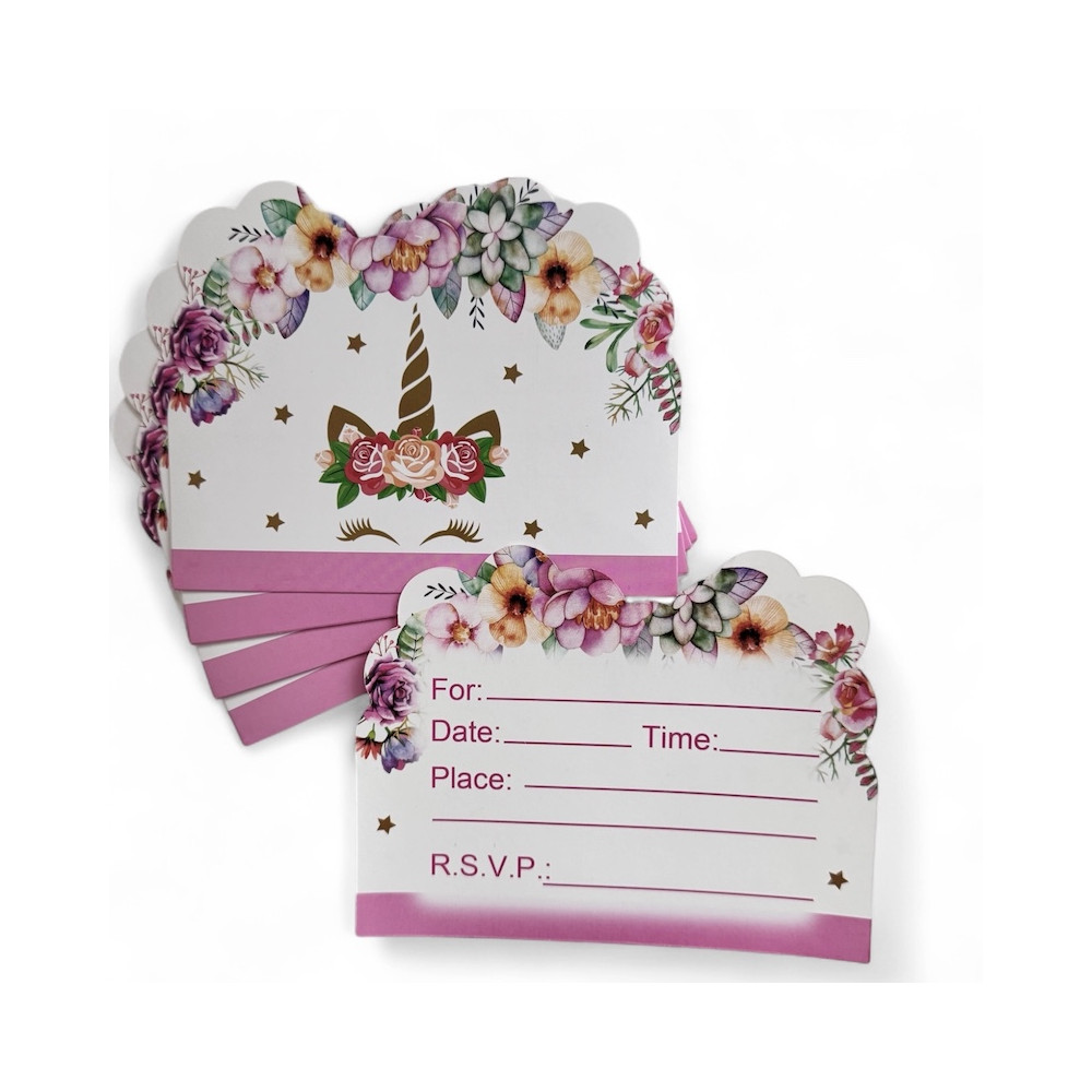10 stk Enhjørning invitasjonskort. Kortene har engelsk skrift, er 14 cm lange og 11 cm brede.