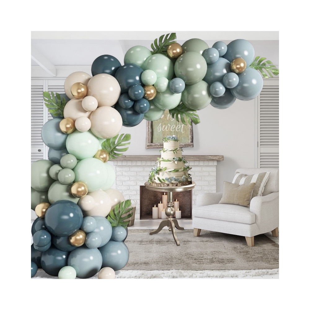 Denne ballongbuen med 130 ballonger har duse, naturinspirerte farger i grønt, blått, beige og gull – en veldig elegant og rolig kombinasjon.