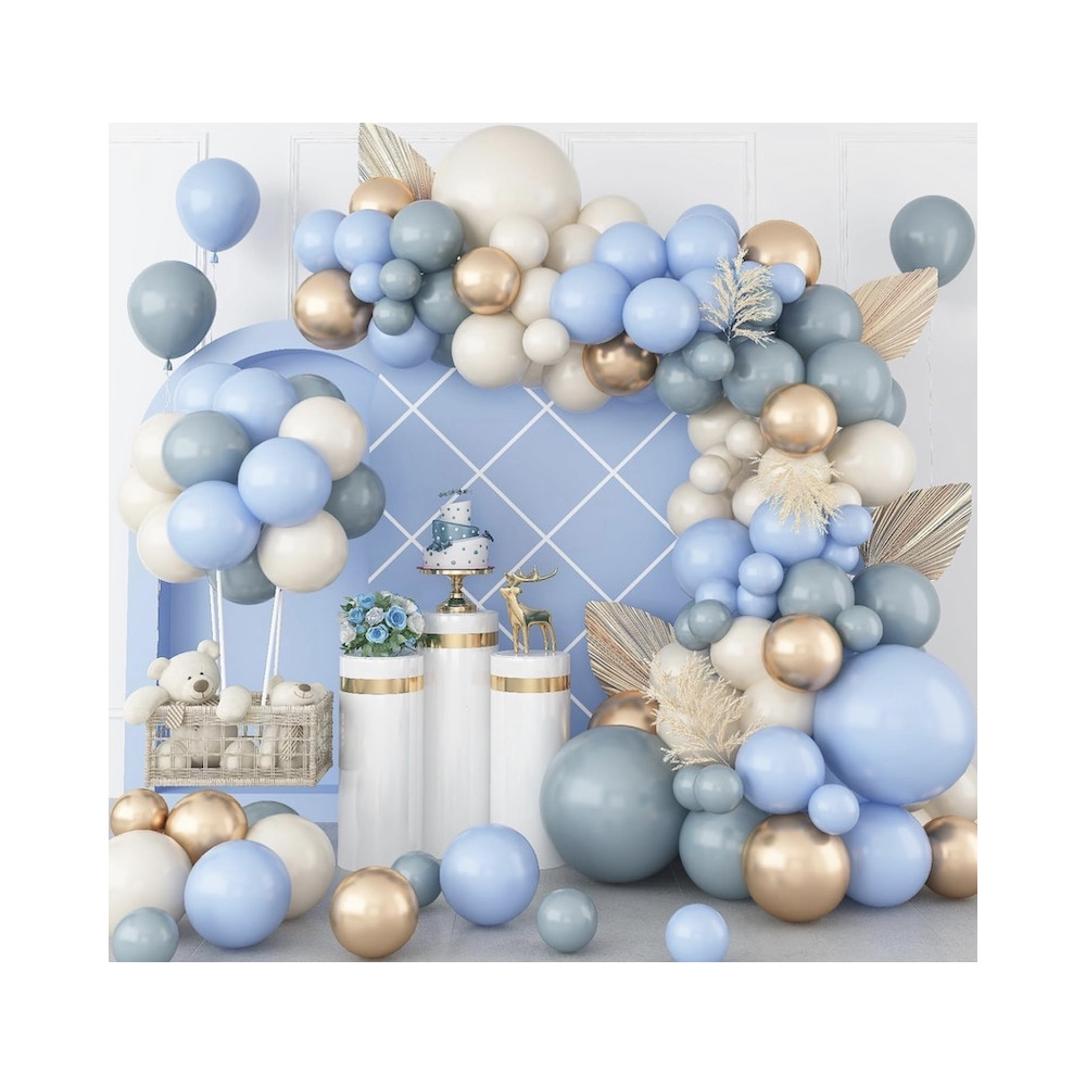 Nydelig ballongbue med 130 ballonger i duse blå, sandfargede og skinnende champagne gull farger.