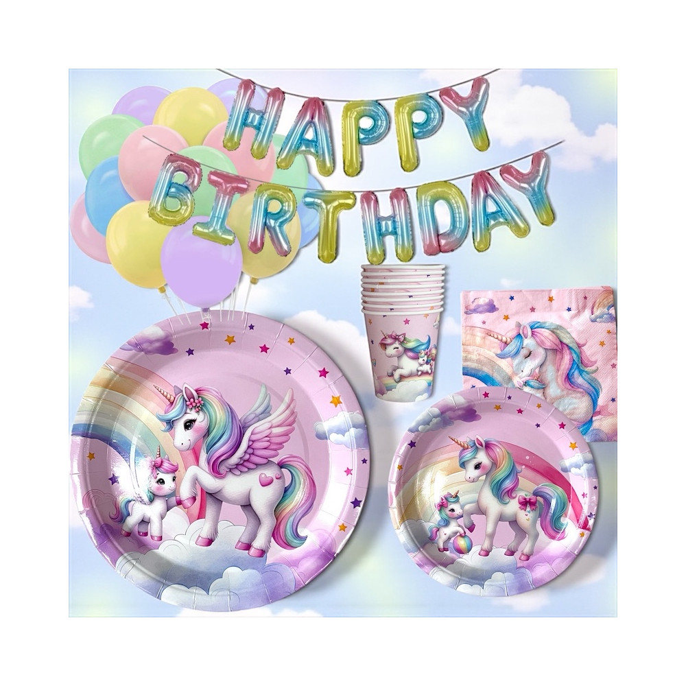 Nydelig Enhjørning bursdagspakke i lekre pastellfarger, med banner og ballonger. Settet består av: