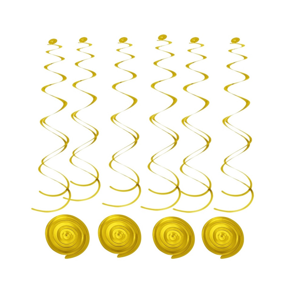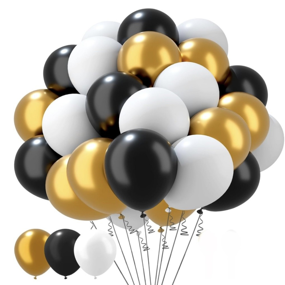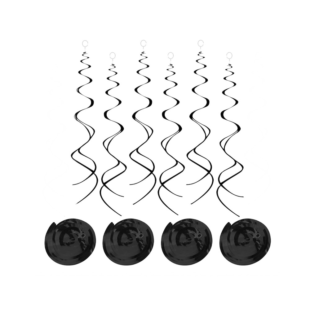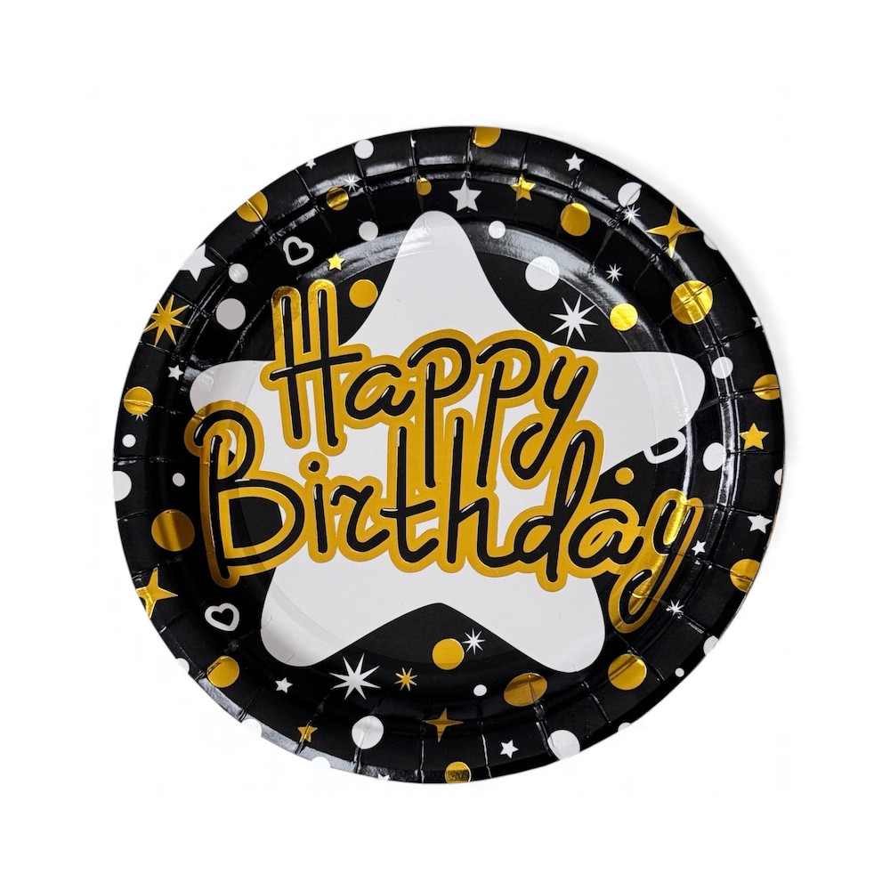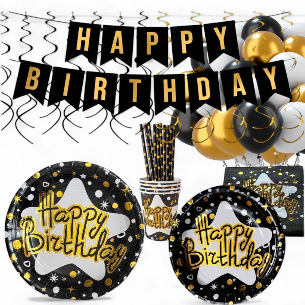 Flott bordpakke i sort og gull til 10 gjester, med swirls og bursdagsbanner i sort og gull.