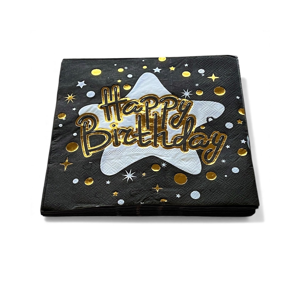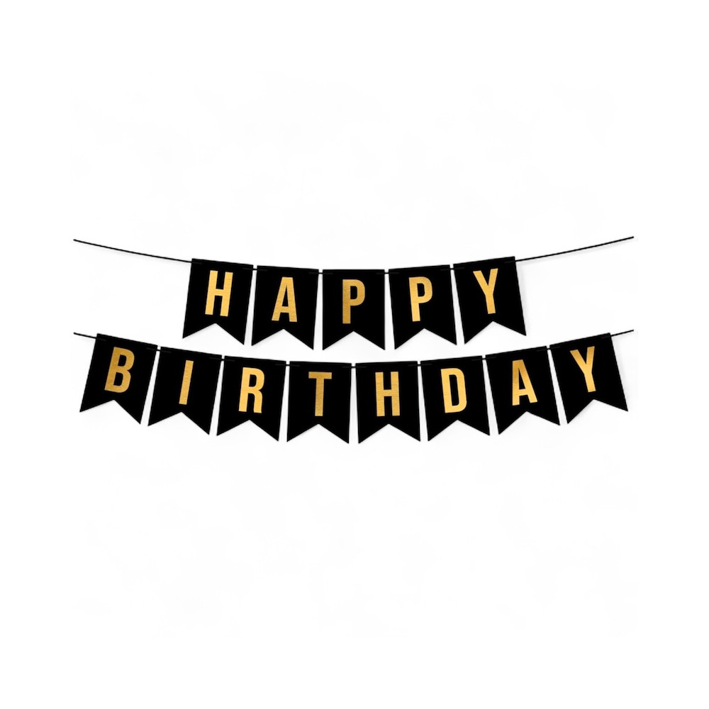Happy Birthday pappbanner i sort med gullskrift. Hver del er 16 cm lang og 12 cm bred og monteres enkelt sammen med medfølgende bånd.