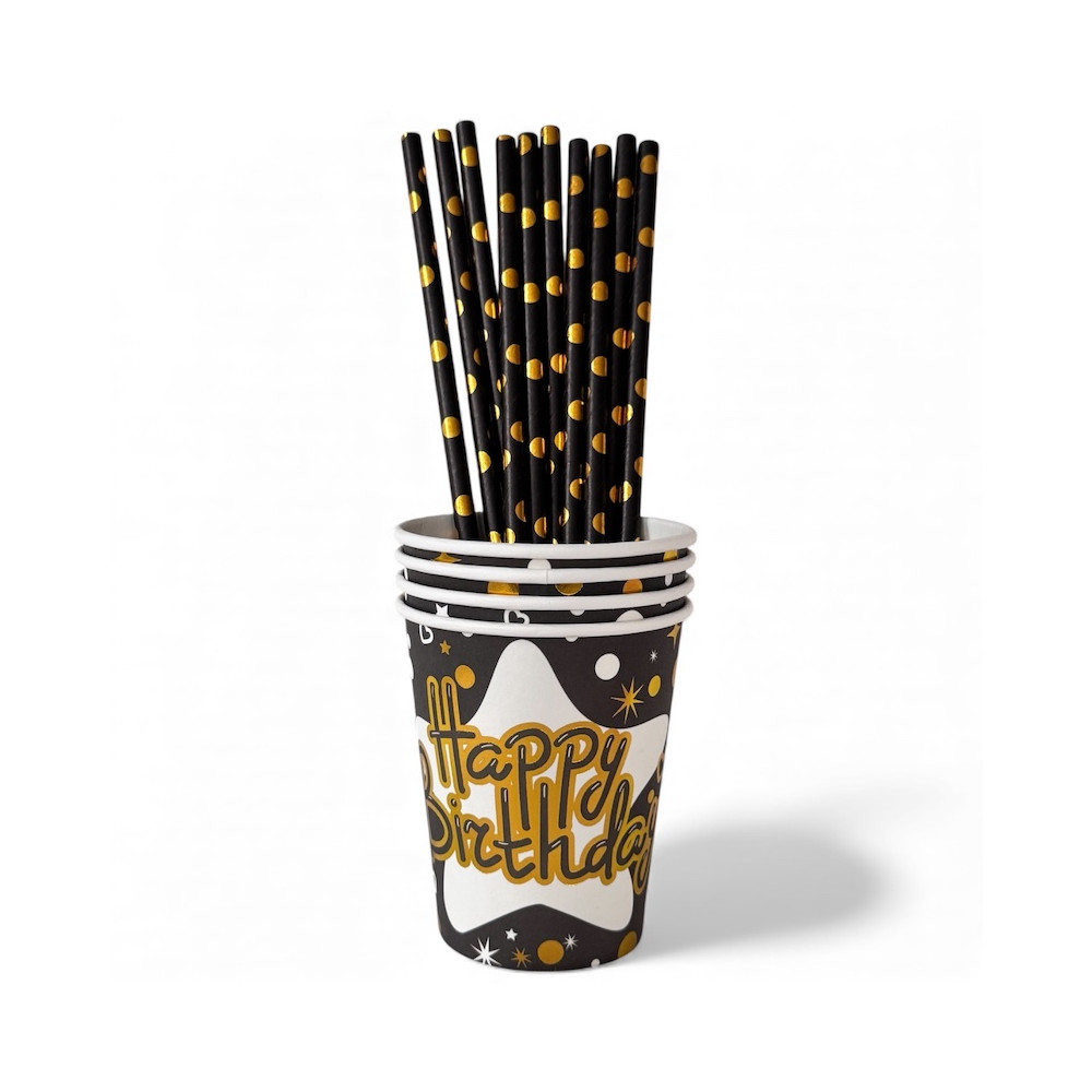 10 stk sorte pappkopper med gullskrift. Koppene er 8.5 cm høye.