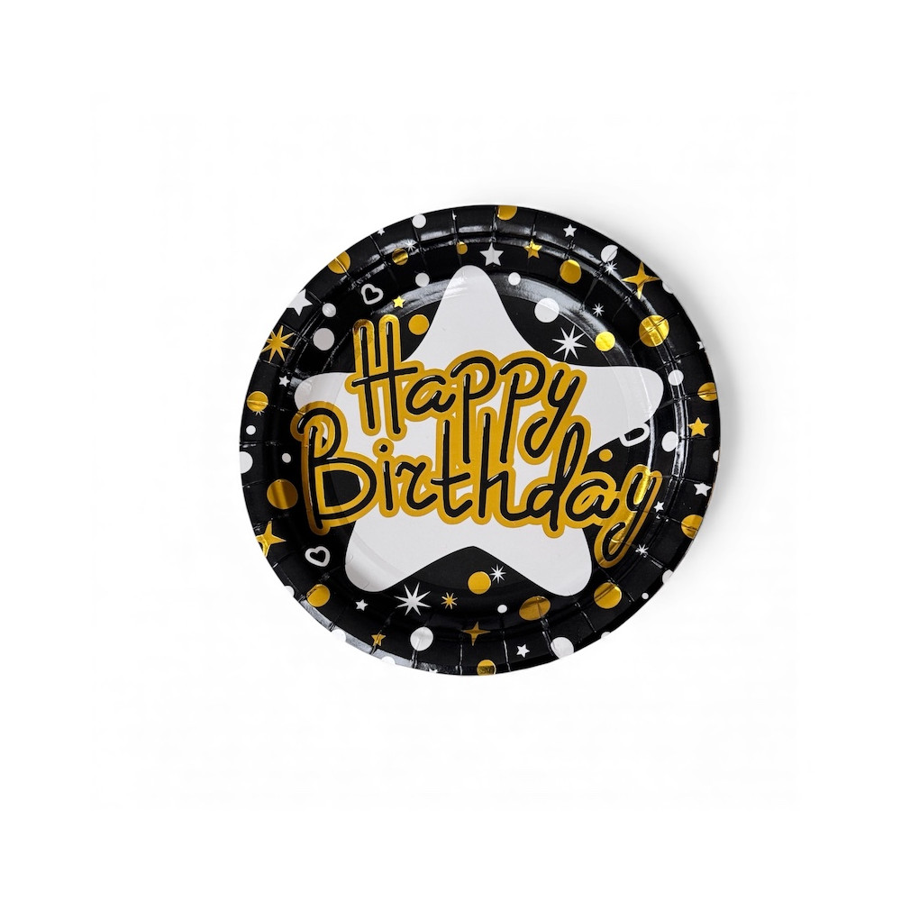 10 stk små papptallerkener med Happy Birthday i gullskrift.