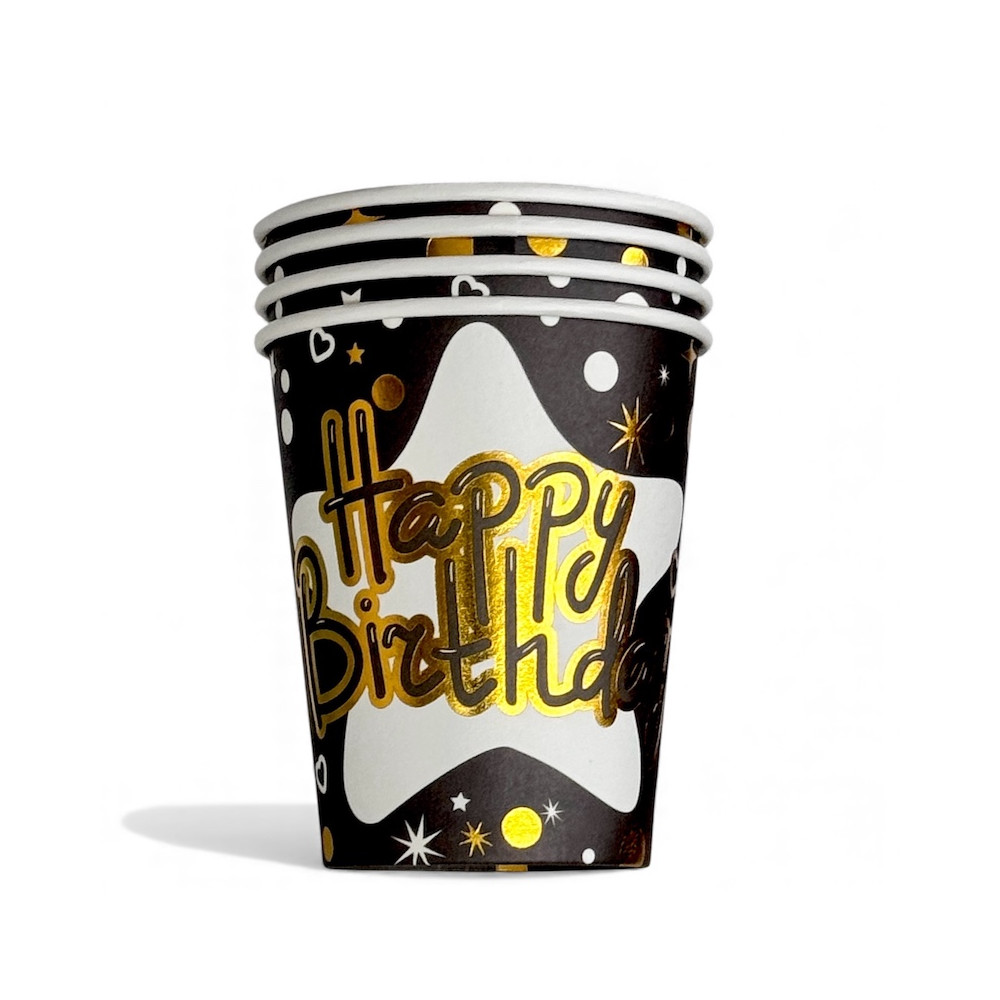 10 stk små papptallerkener med Happy Birthday i gullskrift.