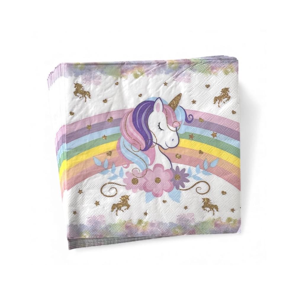 Flott Enhjørning bordpakke med muffinsomslag og stor regnbue folieballong.