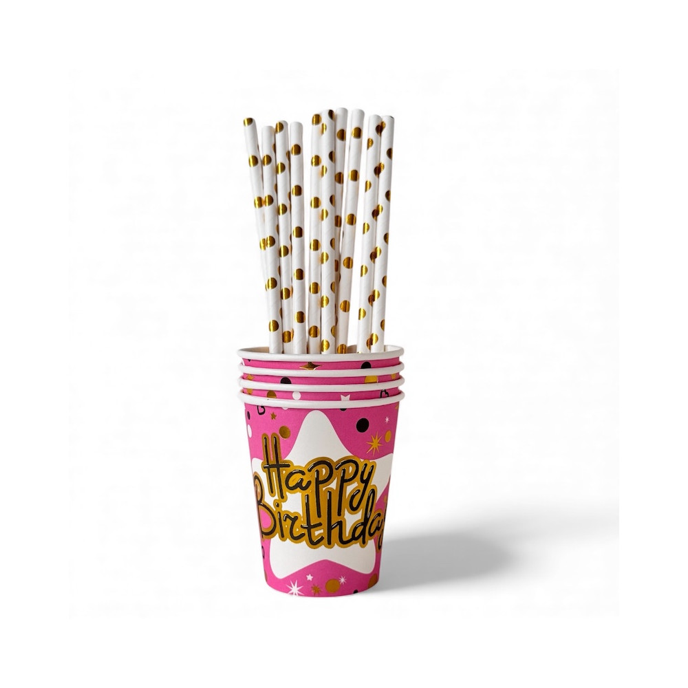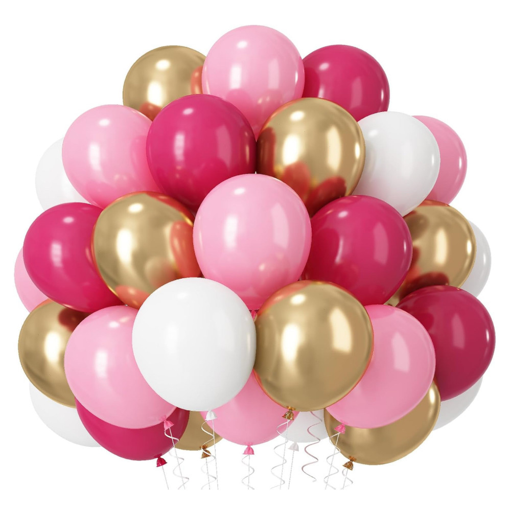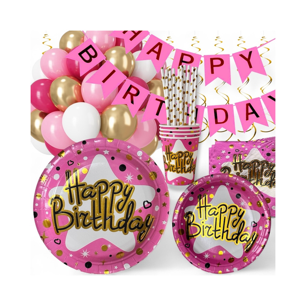 Flott bursdagspakke i rosa, hvitt og gull til 10 gjester, med swirls, ballonger og bursdagsbanner. Her er alt du trenger til å dekke bordet og pynte til fest. Trenger du flere tallerkner og kopper, kan dette kjøpes separat.