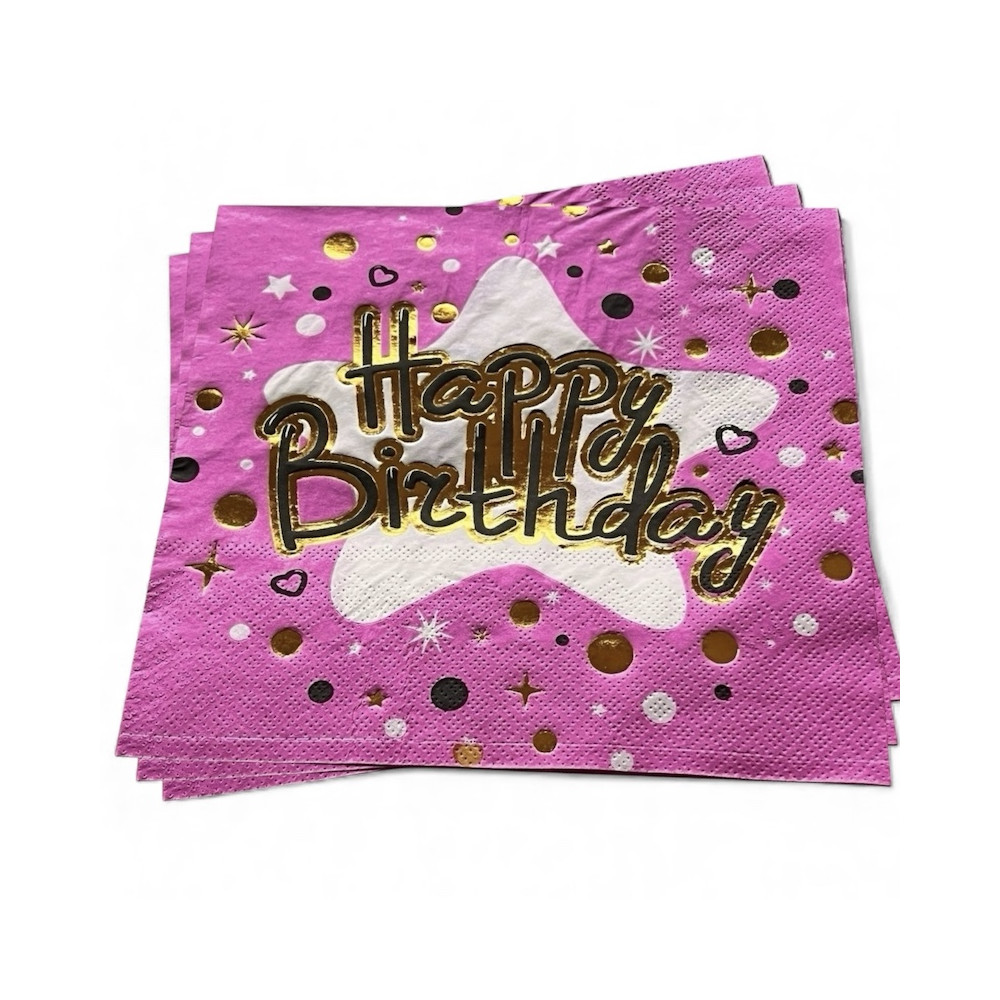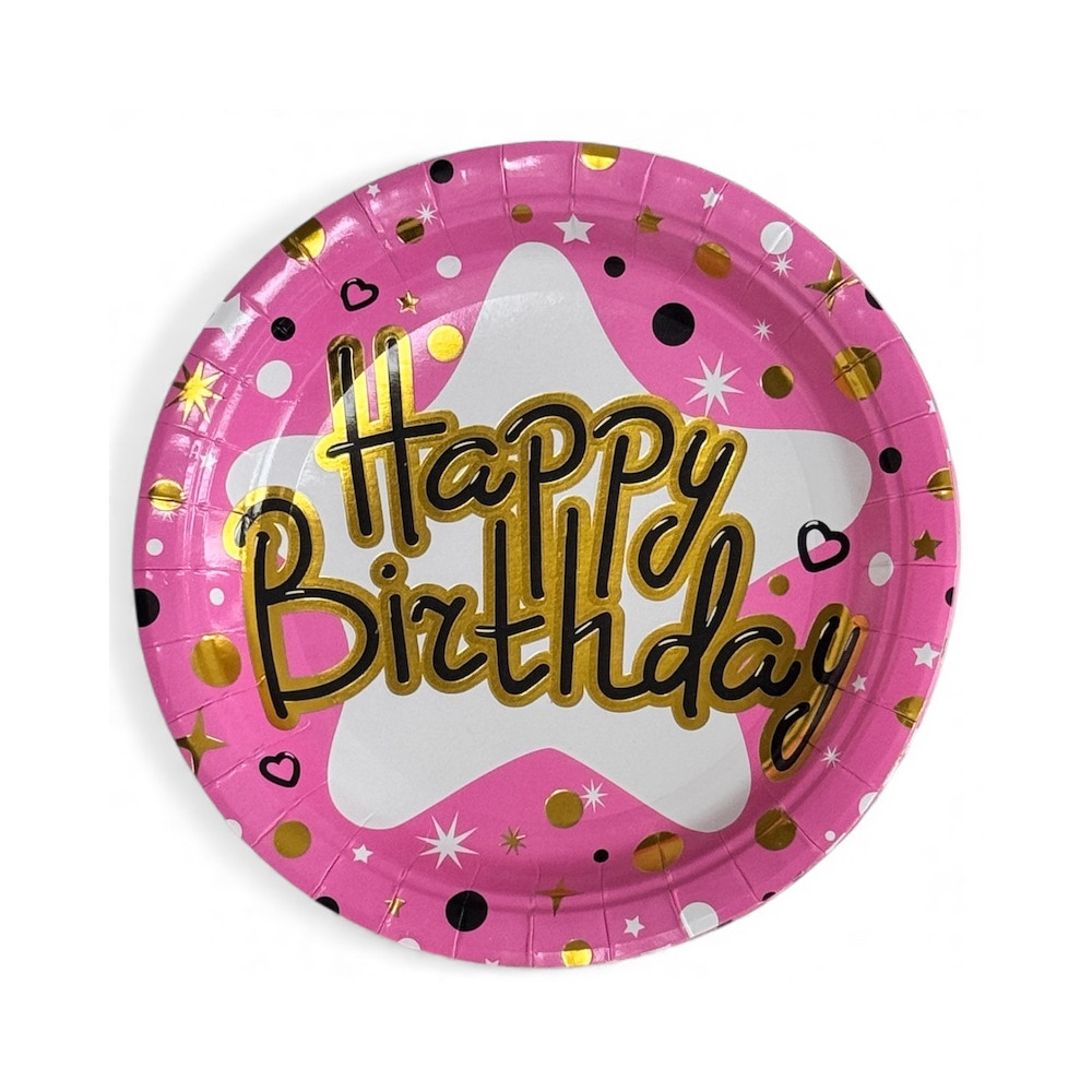 Rosa Happy Birthday pappbanner med gullskrift. Hver del er 16 cm lang og 12 cm bred og monteres enkelt sammen med medfølgende bånd.