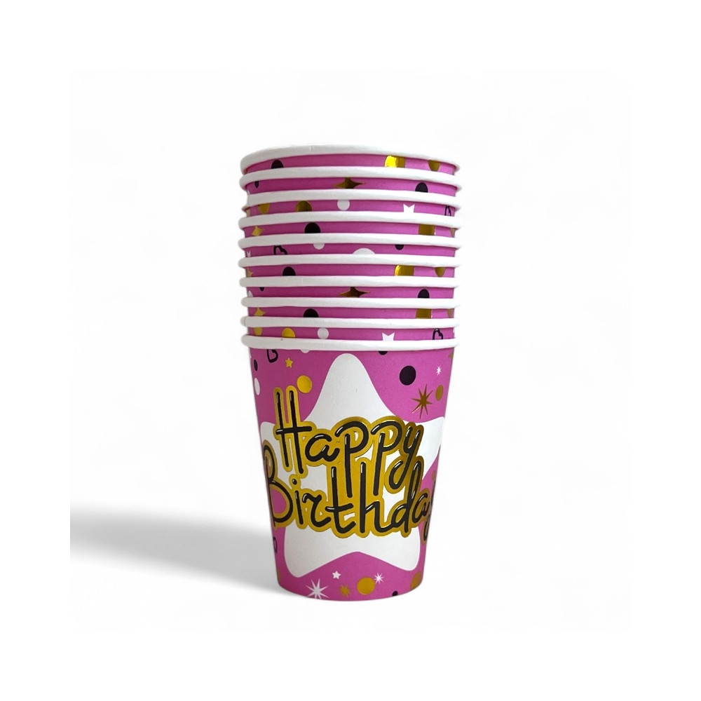 10 stk store Happy Birthday papptallerkner i rosa, hvitt og gull.