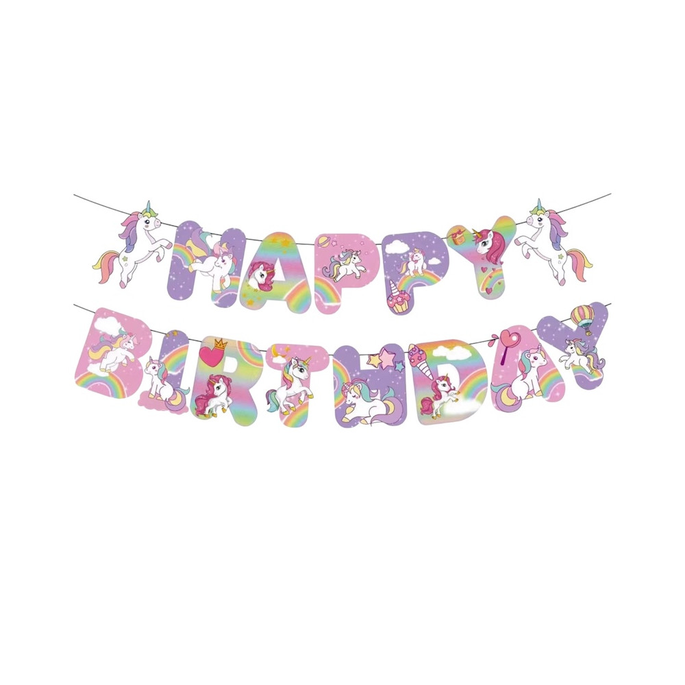 Enhjørning bursdagsbanner med pappfigurer. Hver del festes enkelt sammen med medfølgende bånd.