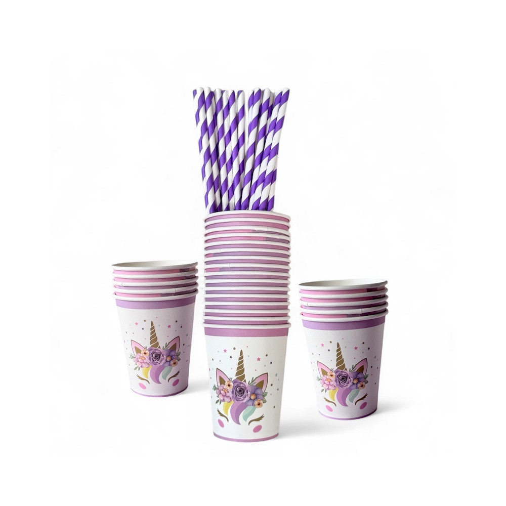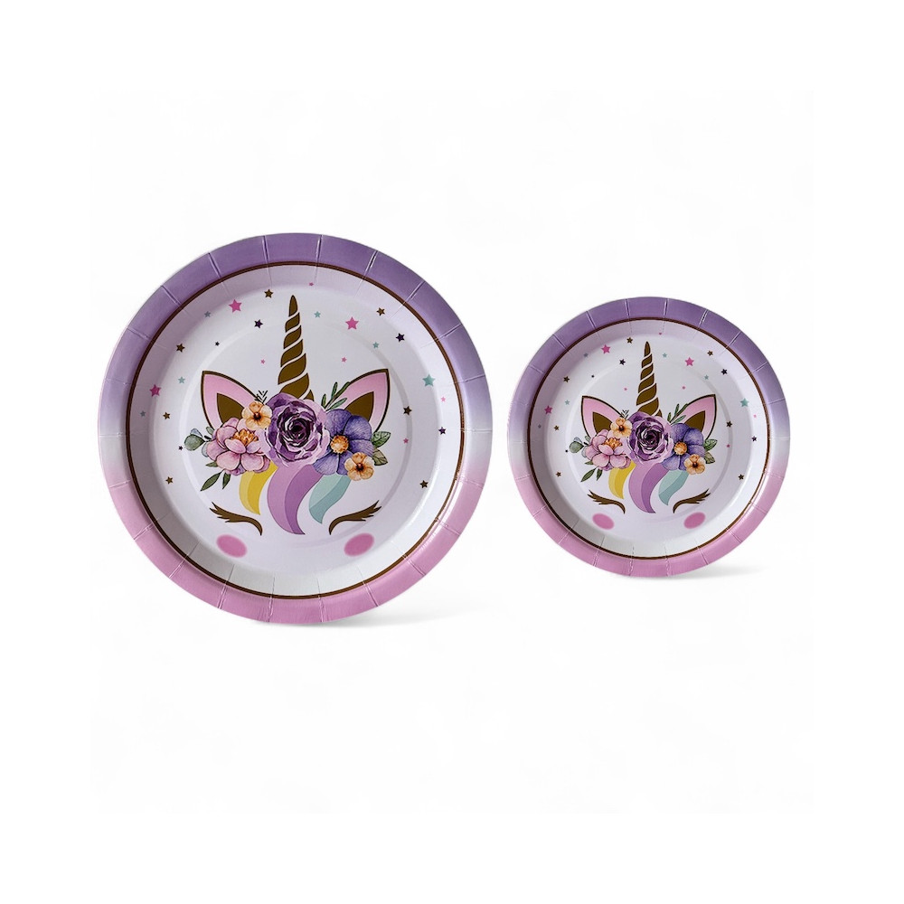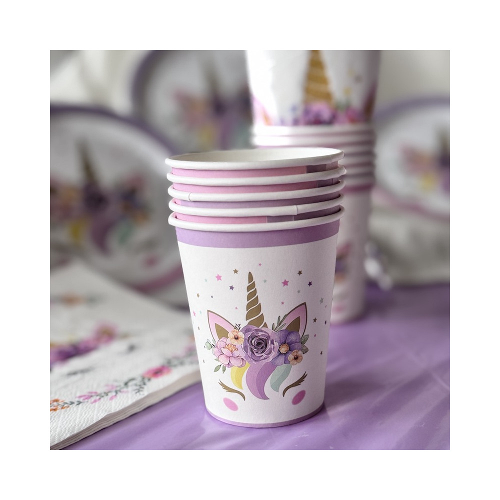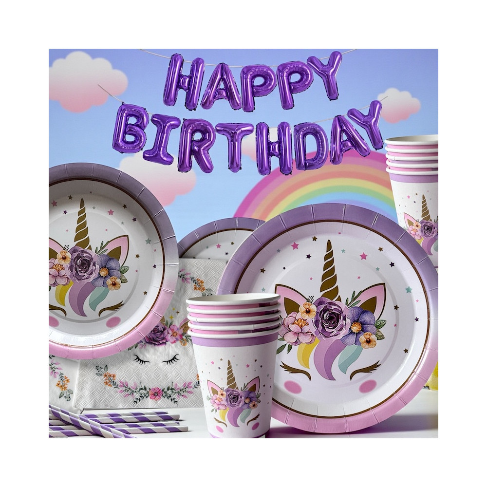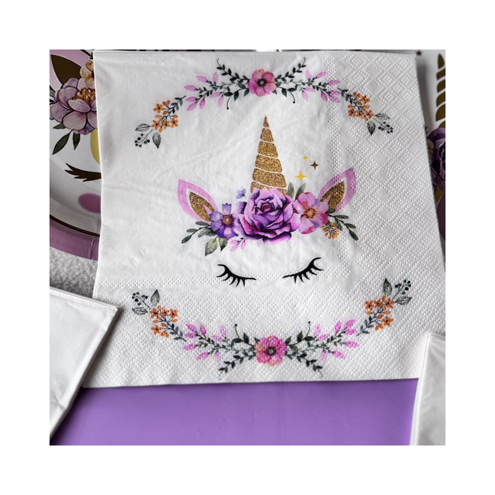 Nydelig Enhjørning bursdagspakke i vakre, varme lillatoner! Denne pakken inneholder alt du trenger for å dekke bordet og pynte til fest.
