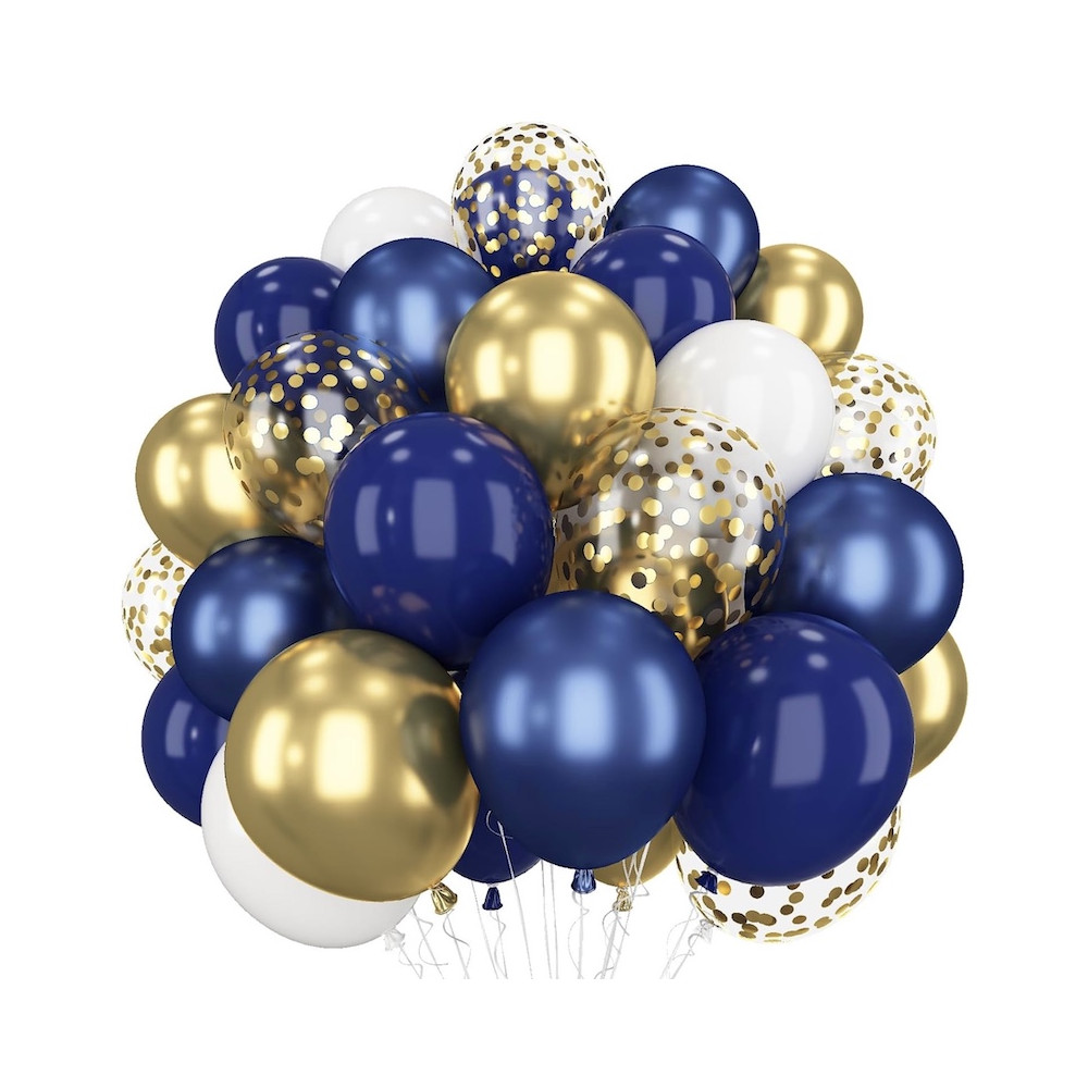 40 stk flotte ballonger i gull, hvitt og mørkeblått. Med så mange ballonger kan man skape utallige forskjellige dekorasjoner; Lage en stor, imponerende bukett, lim de opp i taket med de medfølgende limputene, monter dem på ballongstativ eller pinner (kjøpes separat), eller bind de sammen til en liten ballongremse. Med 40 ballonger er dine dekorasjonsmuligheter uendelige – Gi ethvert arrangement den perfekte touch!